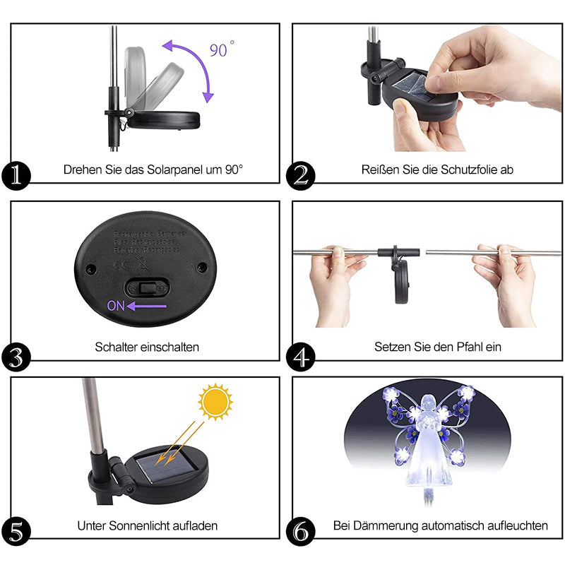 • [Energieeffizienz] 100 % solarbetrieben und keine Verkabelung. Schalten Sie den Netzschalter vor dem Gebrauch ein. Die Solar-Engelspfahllichter laden und speichern tagsüber automatisch Energie, und nachts leuchten diese Solar-Engel-Lichter im Freien automatisch auf, um Ihren Garten zu beleuchten, wodurch Sie Zeit und Stromkosten sparen.