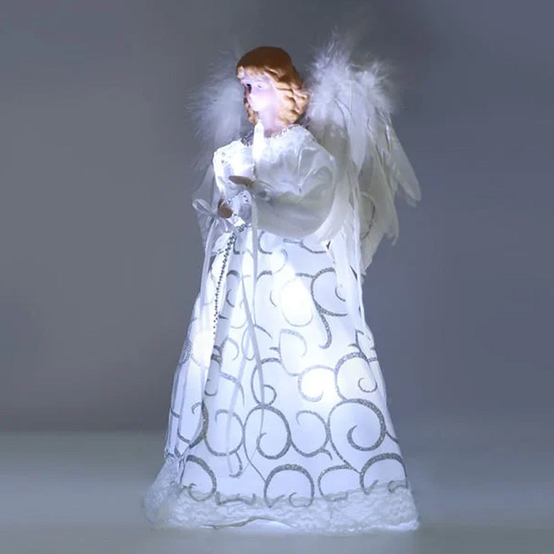 Wenn er an eine Steckdose oder das Ende einer Lichterkette angeschlossen wird, leuchten die Flügel des Engels in einem warmen weißen Licht, während sie hin und her flattern.