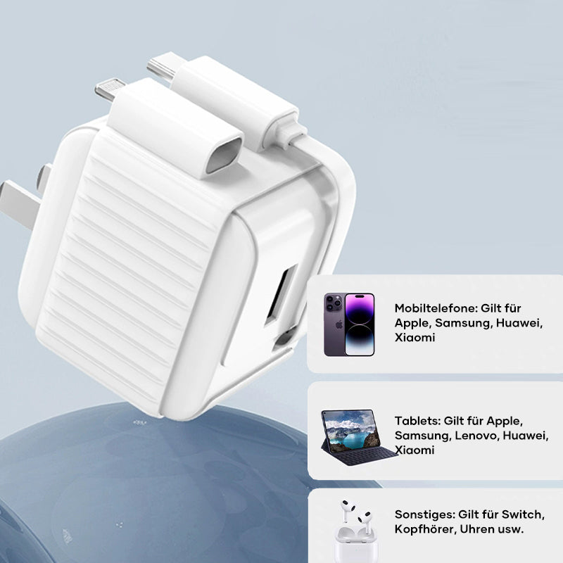 - 1* Ladegerät mit einziehbarem Aufladekabel, 1* Typ-C-auf-Lightning-Adapter, 1* Lederhülle