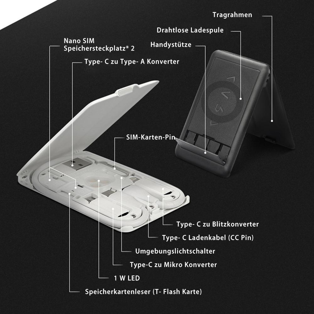 - Schalten Sie einfach die KableCARD-Karte ein, um die Telefonhalterfunktion in einen Telefonhalter umzuwandeln, sodass Sie Filme bequem kabellos aufladen, ansehen, füllen und mitnehmen können. Zusätzliche Lichtquelle - Umgebungslicht Wir haben einen dreistufigen Schalter für KableCARD mit einer diffusen Folie und einer reflektierenden Folie entworfen, die 1 W weiches diffuses Licht auf einen Tisch oder eine Wand reflektiert, um effektives polarisiertes Licht zum Schutz Ihrer Augen zu erzeugen.