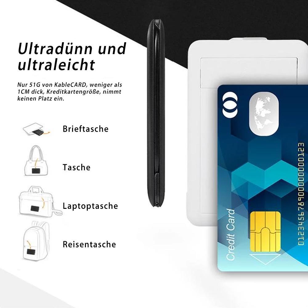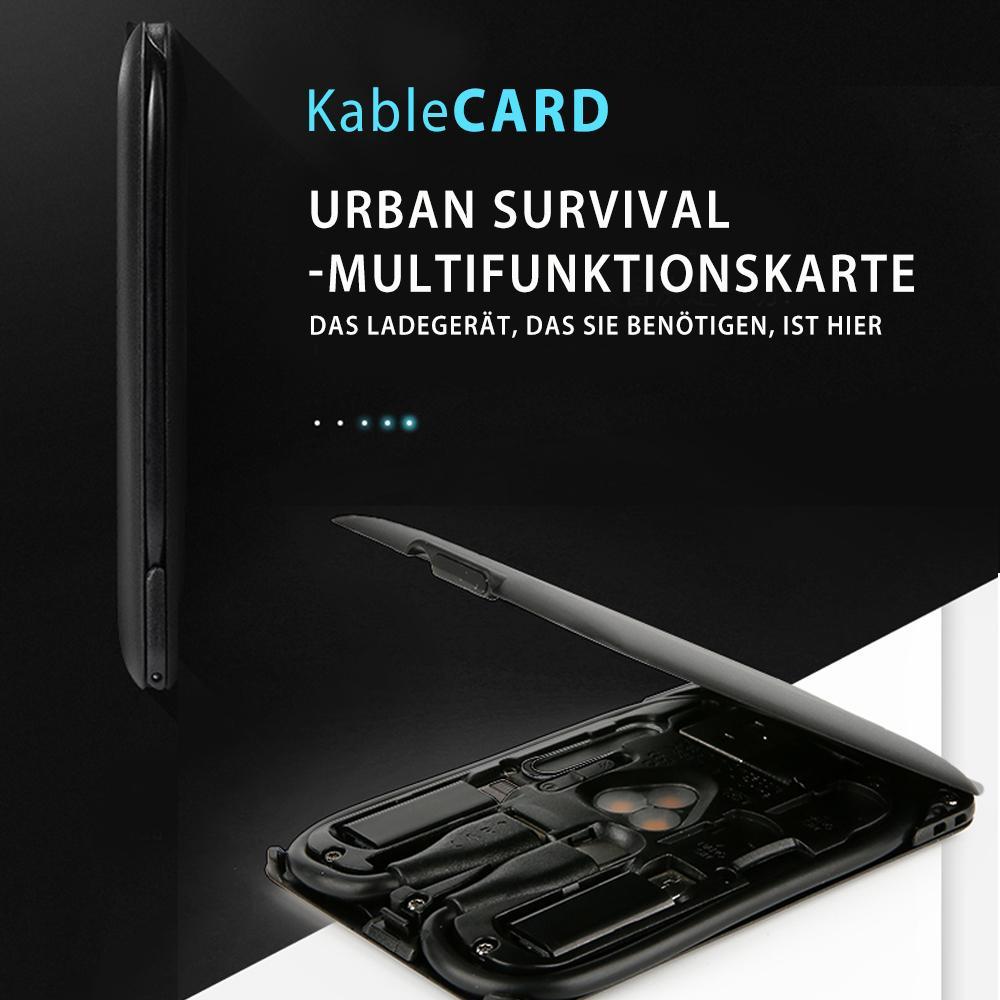 - Wenn andere immer noch keinen Strom mehr haben, müssen sie aus der Tiefe des Beutels nach der Ladeleitung suchen. ... mit KableCARD müssen Sie sich keine Gedanken darüber machen, welche Art von Ladekabel verwendet werden soll. Nehmen Sie die KableCARD einfach aus Ihrer Tasche oder Brieftasche und nutzen Sie sie überall. Wer ist effizienter als Sie?