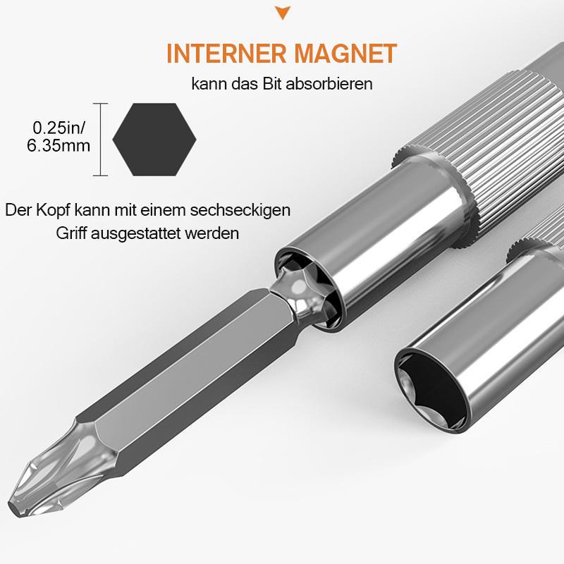 • Der Aufnahmegriff ist für vollelektrische Bohrer und Schraubenschlüssel geeignet, der Funktionskopf ist mit einem Schloss versehen und die Magnetvorrichtung sorgt dafür, dass die Hülse nicht herunterfällt.