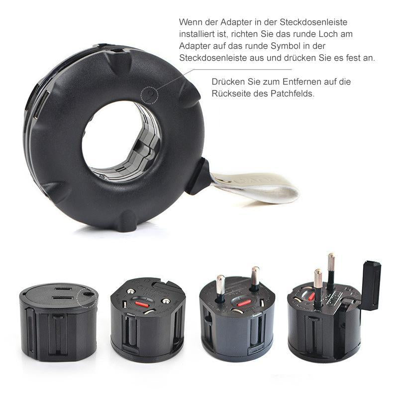 • Reisestecker + Universalbuchse + USB-Ladegerät