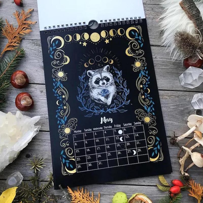 2023 Kalender der geheimnisvollen Tiere des dunklen Waldes enthält 12 Illustrationen. Botanische Motive, magische Kreaturen und Pflanzen, Wald, Natur, wildes Leben, der Mond und die Sterne und die Kraft in uns.