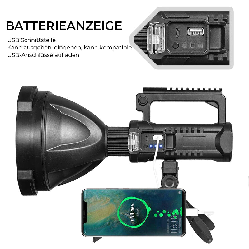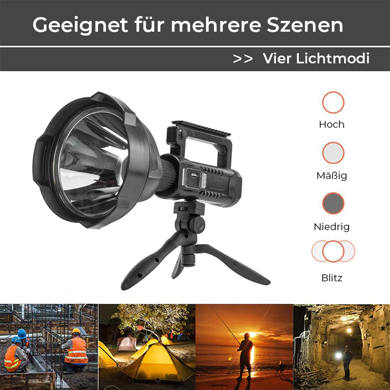 Superhelle Scheinwerfer, große Leuchtweite, große Reichweite, drehbar und abnehmbar. Es ist leicht zu transportieren und kann mit einem Stativ ausgestattet werden, das sich sehr gut für Outdoor-Aktivitäten als Suchscheinwerfer eignet, z. B. Wandern, Camping, Jagen, Abenteuer, Nachtfischen usw.