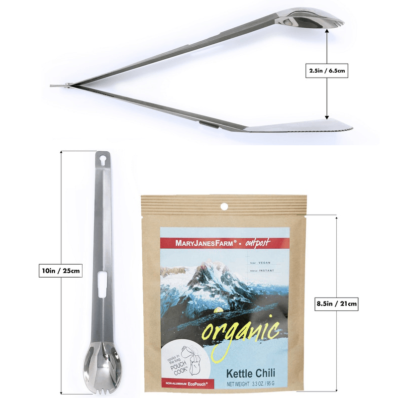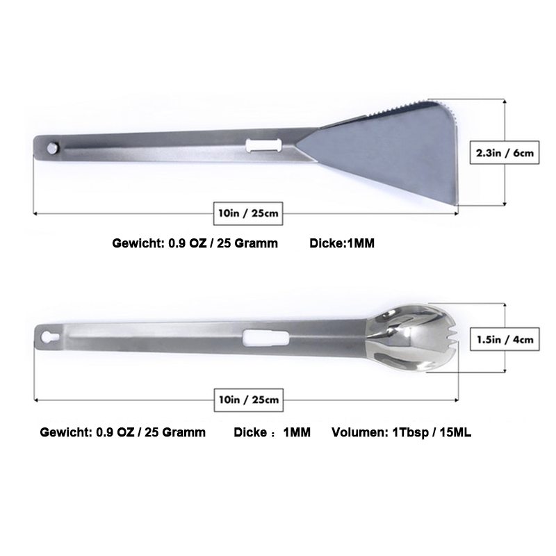 Titan Multi-Geschirr im Freien ist ein leichtes SUPER-Multi-Geschirr, das kompakt und minimalistisch ist. Es besteht aus zwei separaten Titan-Utensilien, einem Spatel und einem langen Sporken, die sich beim Zusammenfügen in eine praktische Zange verwandeln. Es ist der Gipfel der Outdoor-Utensilien aus den hochwertigsten verfügbaren Materialien.