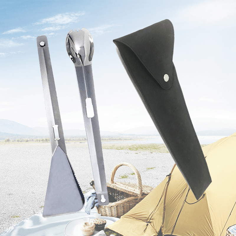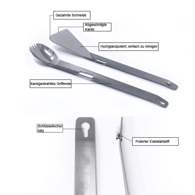 • Flexibel - Der Verbindungsmechanismus für die Zange ist ein kleiner Edelstahlstift, der am Spachtel befestigt ist und in einen Schlüssellochschlitz am Ende des Sporkes eingesetzt wird. Die Zangen verwenden die Titanmaterialien, um mit der perfekten Kraft zu arbeiten. Der Spatel hat eine abgeschrägte Kante, durch die er unter den leckersten Essensstückchen geraten kann.