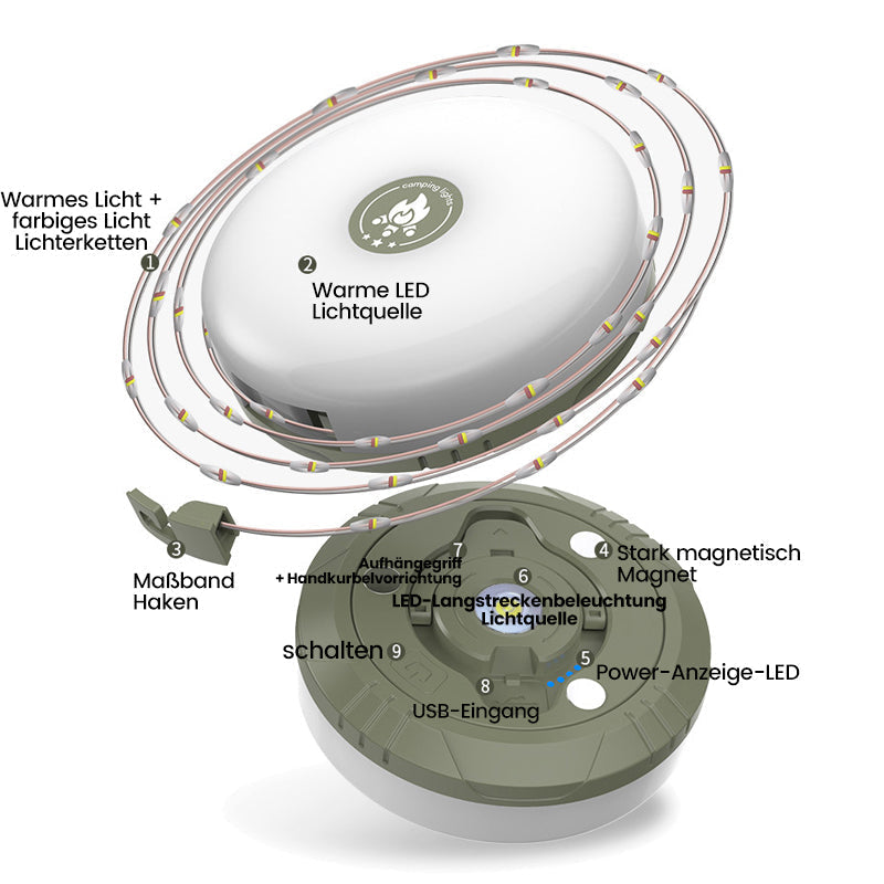 • ◪Fügen Sie Wärme hinzu: Beleuchten Sie Ihre Outdoor-Abenteuer und verleihen Sie Ihren Nächten Wärme mit diesen Zelt-Lichterketten. Sie können Ihr Zelt beleuchten, eine gemütliche Atmosphäre schaffen und Campingleuchten und Ambiente-Lichterketten in einer kompakten Einheit kombinieren.