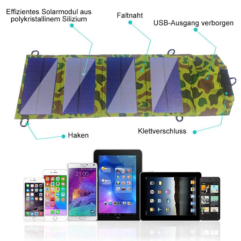 Mit dem Solarpanel können Sie jedes Gerät wie iPhone, iPad, Smartphone, Action-Kamera, Android-Gerät, Go-Pro, GPS, Lautsprecher und vieles mehr aufladen! -