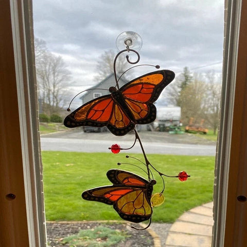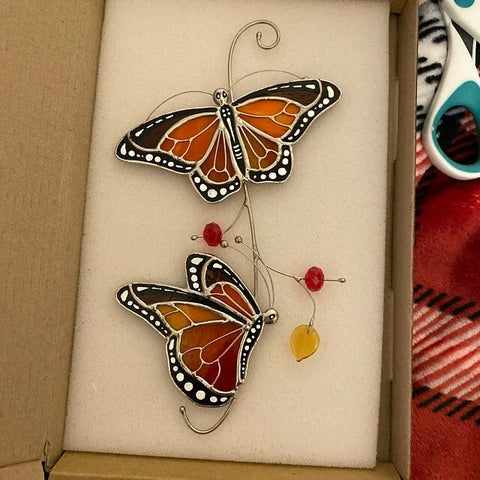 💖Sonnenfänger von Monarchfaltern auf einem Zweig besteht aus Buntglas. Dies ist eine helle Fensterdekoration, die alle Blicke auf sich zieht. Und jenseits aller Zögern ist es ein einzigartiges Erinnerungsgeschenk für verlorene Liebende💕