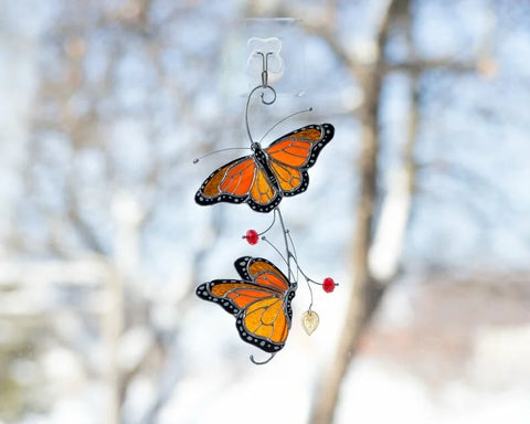 Solch ein niedlicher Sonnenfänger aus zwei summenden Monarchfaltern aus Buntglas ist eine perfekte Fensterdekoration sowie ein schönes Geschenk für jeden Anlass. Ich bin sicher, Ihre Mutter, Großmutter, Ehefrau, Freundin, Schwester oder Freundin wird in ihn verliebt sein. Dieser Monarchfalter-Sonnenfänger kann in der Nähe eines summenden Schmetterlingsfutterspenders aufgehängt werden, um die Aufmerksamkeit des Monarchfalters auf sich zu ziehen.