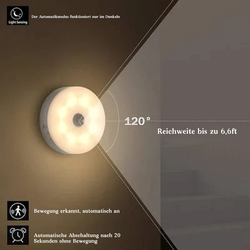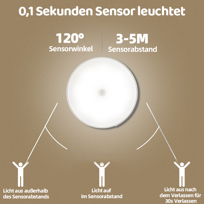 Mit Passiv-Infrarot-Technologie kann das LED-Bewegungssensorlicht menschliche Bewegungen im Dunkeln erkennen und schaltet sich innerhalb von 3 m automatisch ein und nach 30 Sekunden ohne erkannte Bewegung automatisch aus.