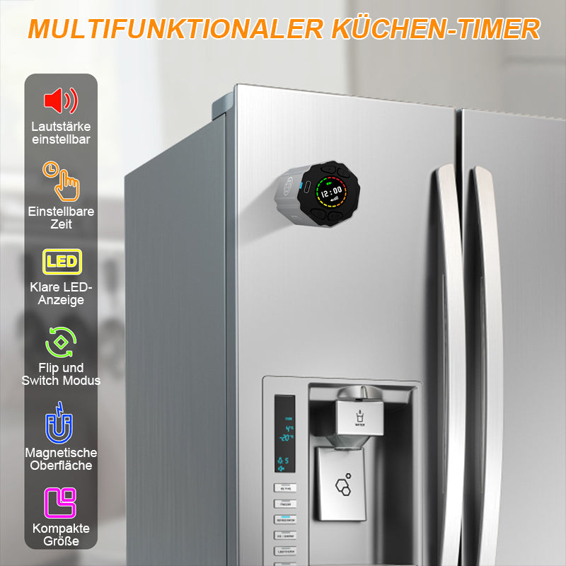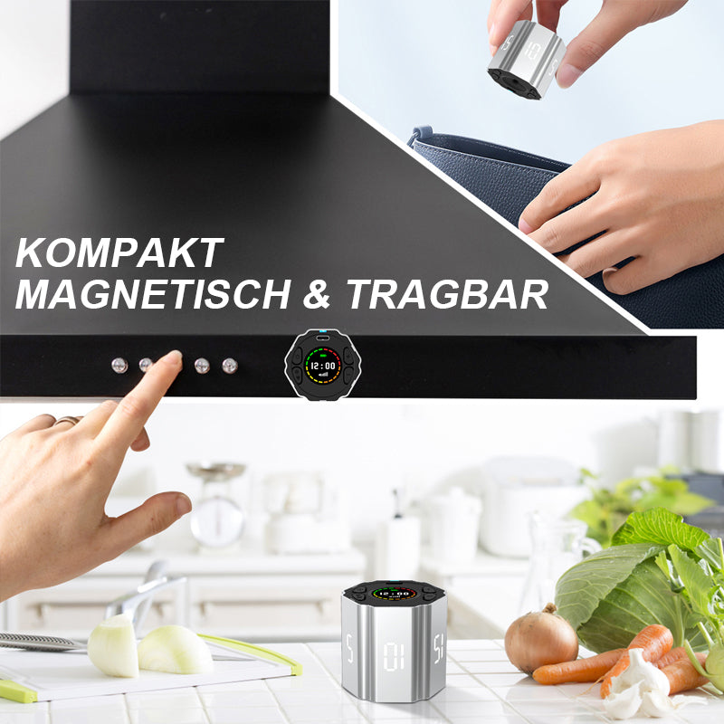 Kompakt, magnetisch und wiederaufladbar. Der Timer hat einen magnetischen Sockel, der am Kühlschrank oder an jeder anderen Metalloberfläche befestigt werden kann, sodass Sie die Hände frei haben, während Sie die Zeit messen.