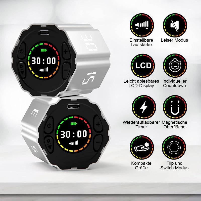 Super einfach zu bedienen. Flip zum Starten des Countdowns. Außerdem können Sie durch Drücken der beiden Tasten ganz einfach eine individuelle Countdown-Zeit einstellen. Ändern Sie Ihr Zeitmanagement und lassen Sie jede Minute zählen.