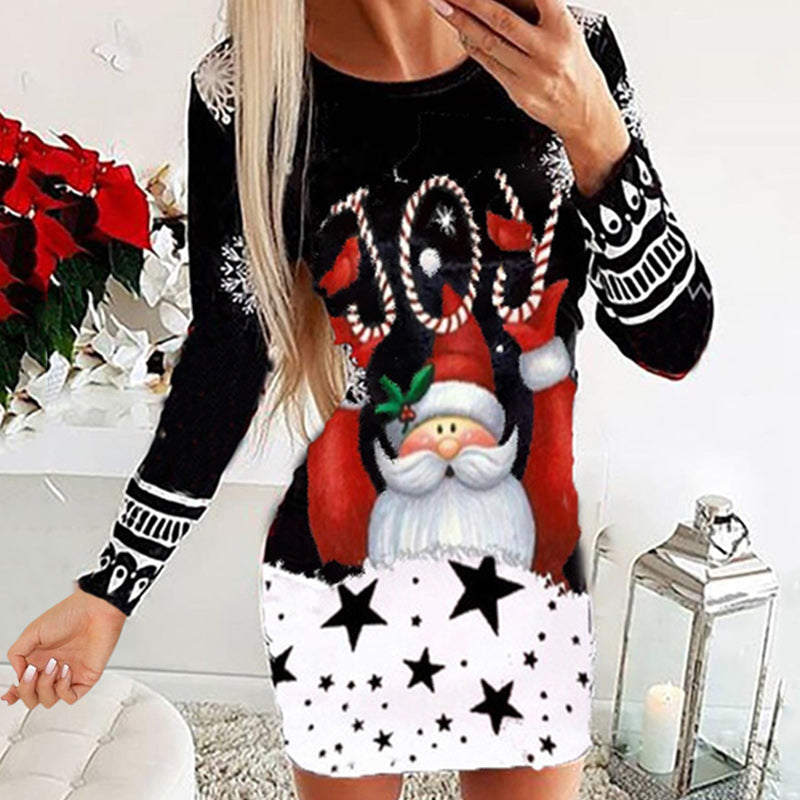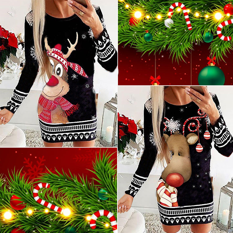 • 1* Langärmliges, sexy Kleid mit Weihnachtsdruck und Rundhalsausschnitt