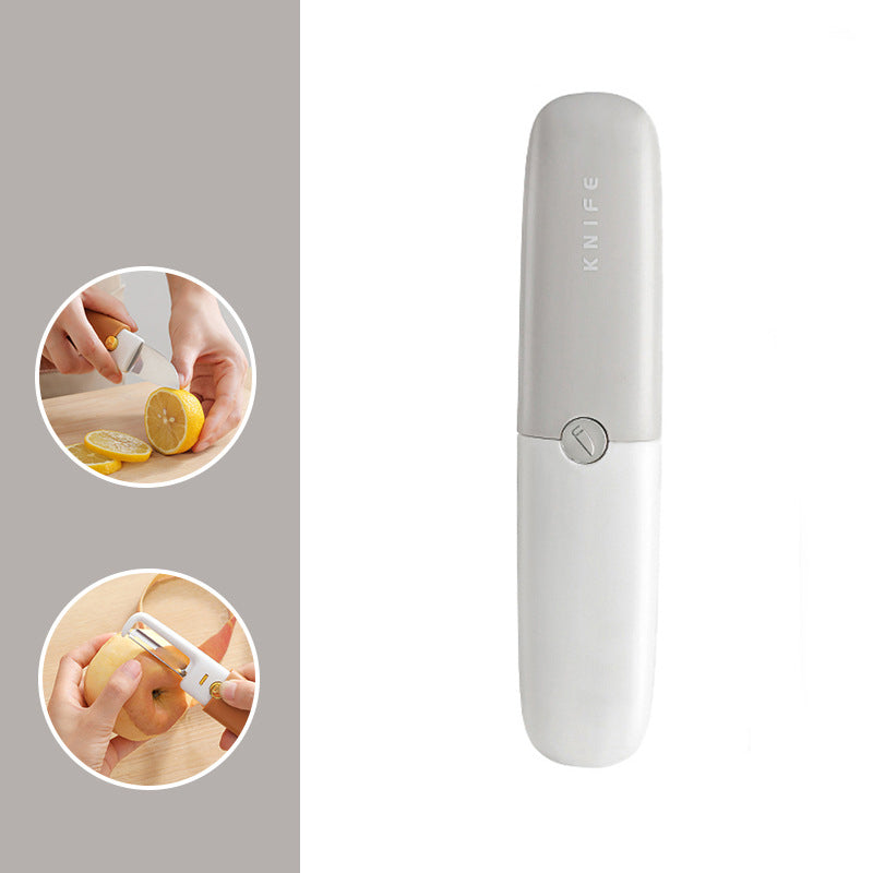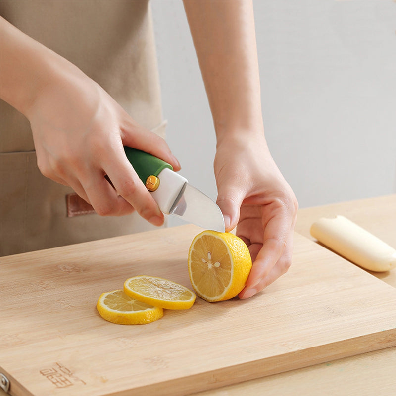 • [2-in-1 Cutter]Dieser Cutter ist mit zwei Funktionen ausgelegt. Eine Seite ist eine Klinge, kann verwendet werden, um Obst und Gemüse zu schneiden, das andere Ende ist ein Schäler, verwendet, um Obst und Gemüse zu schälen. Der Metallverschluss lässt sich leicht öffnen.
