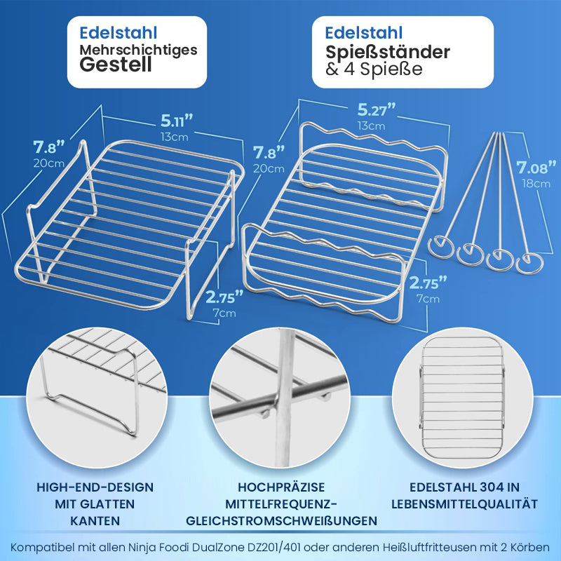 • Vielseitige Verwendungsmöglichkeiten: Die Edelstahl-Heißluftfritteusengestelle sind mit einer versetzten Höhe konstruiert, sodass Sie das Gestell umdrehen können, um es auf beiden Seiten zu verwenden. Dies gibt Ihnen mehr Platz für größere Portionen von Lebensmitteln und ist dank der glatten, polierten Kanten ein Kinderspiel zu reinigen und zu verwenden.