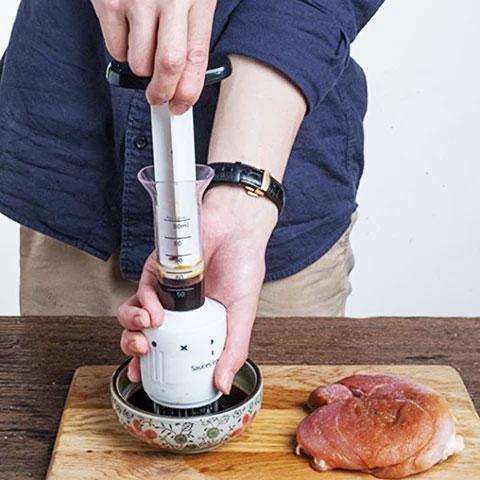 • Einfache Geschmacksverbesserung - Der eingebaute Kolben gibt Marinade über 3 nadelartige Applikatoren in Fleisch ab. Es ermöglicht eine schnelle Sättigung des Lebensmittelinneren mit geschmacksverstärkenden Inhaltsstoffen.