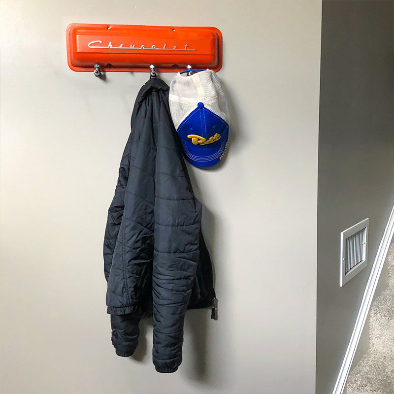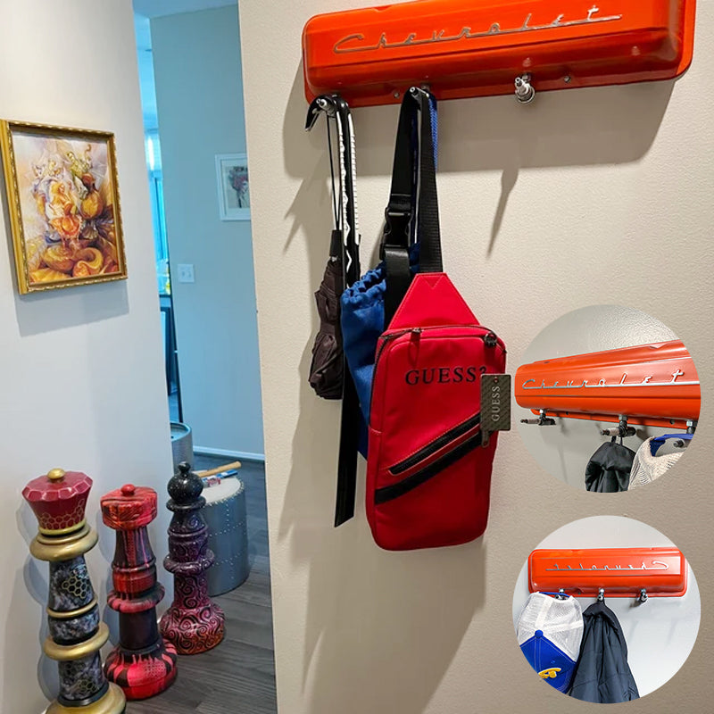 Nicht nur für Garagen! Unser aus Original-Autoteilen gefertigter Bonnet-Garderobenständer verfügt über vier stabile, fest verschweißte Haken, an denen Sie Ihren Lieblingsmantel, Hut oder Rucksack befestigen können!