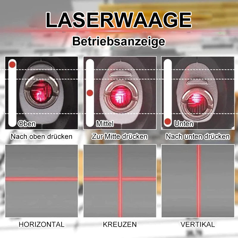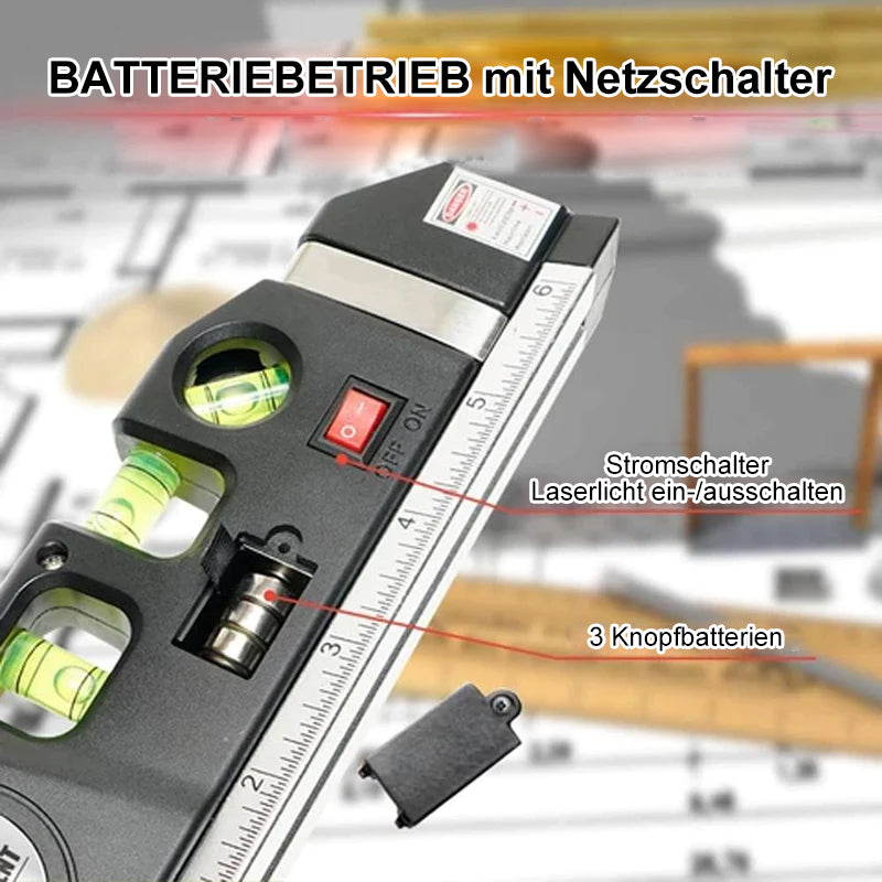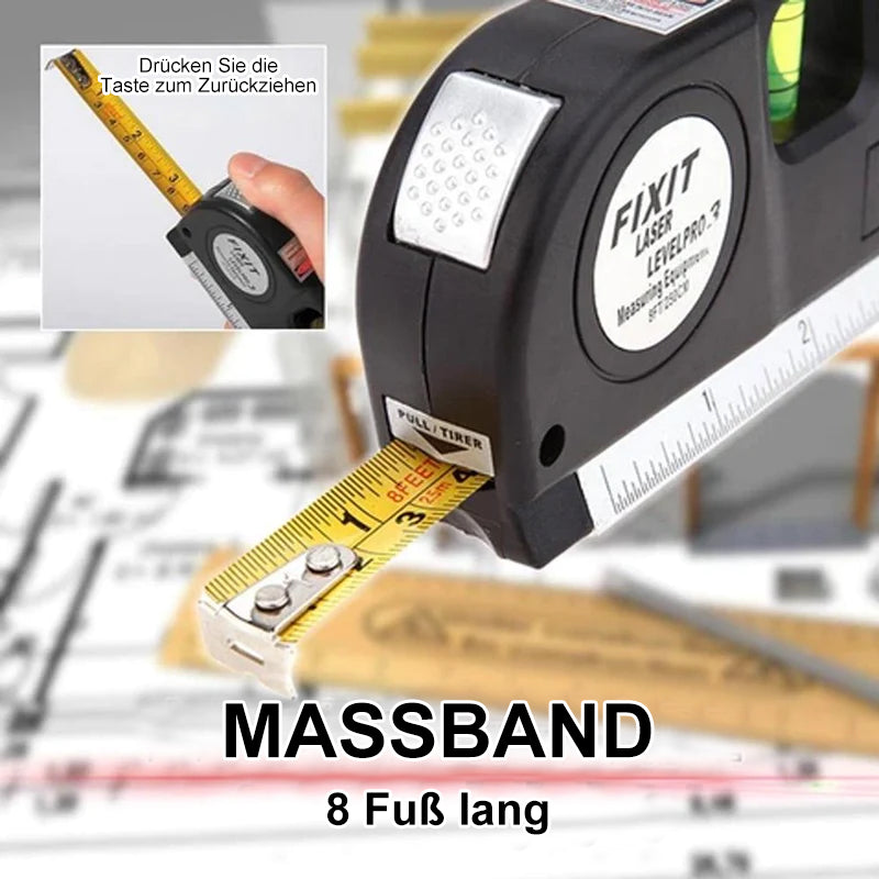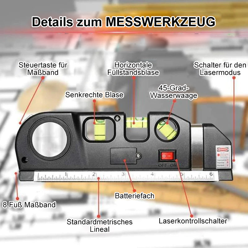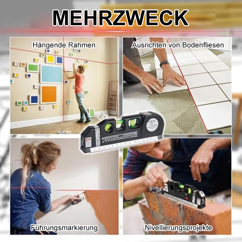 Ein gutes Heimwerkerwerkzeug, das Feinabstimmung von Maßband, Dreifachpegel, Blasenlicht und einem Laserstrahl in einem kombiniert, um die genauesten Ergebnisse zu erzielen.