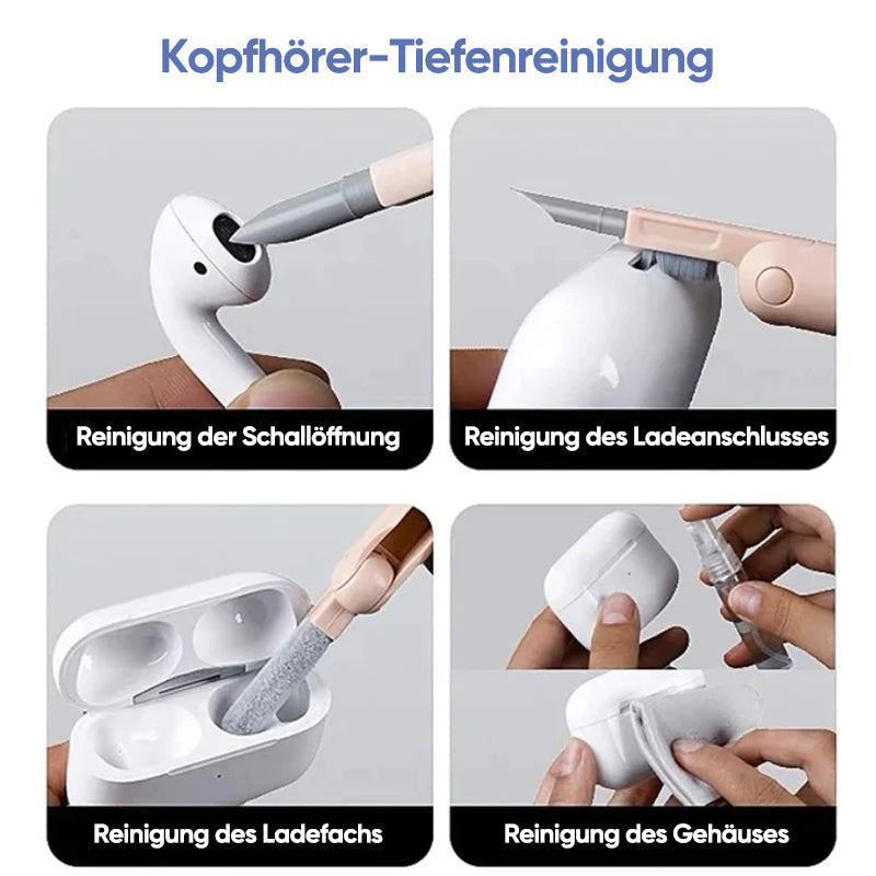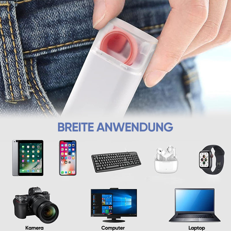 Der ideale Reiniger, um Geräte sauber und makellos zu halten. Mit Bürsten, Wischern und einer Sprühflasche hat er alles, was Sie brauchen, um Staub von Tastaturen, Bildschirmen und Kopfhörern zu entfernen. Er ist kompakt und leicht und eignet sich perfekt für die Reinigung unterwegs. Wir haben Sie.
