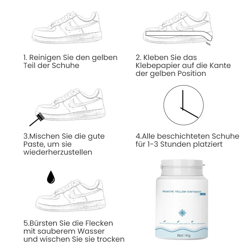 Unser hochwertiges „Schuhaufhellungs-Reinigungsgel“ entfernt Schmutz und Gelb von Schuhen und kann Ihre weißen Turnschuhe effektiv strahlend weiß halten!!