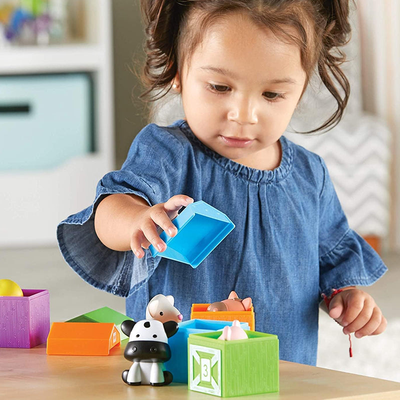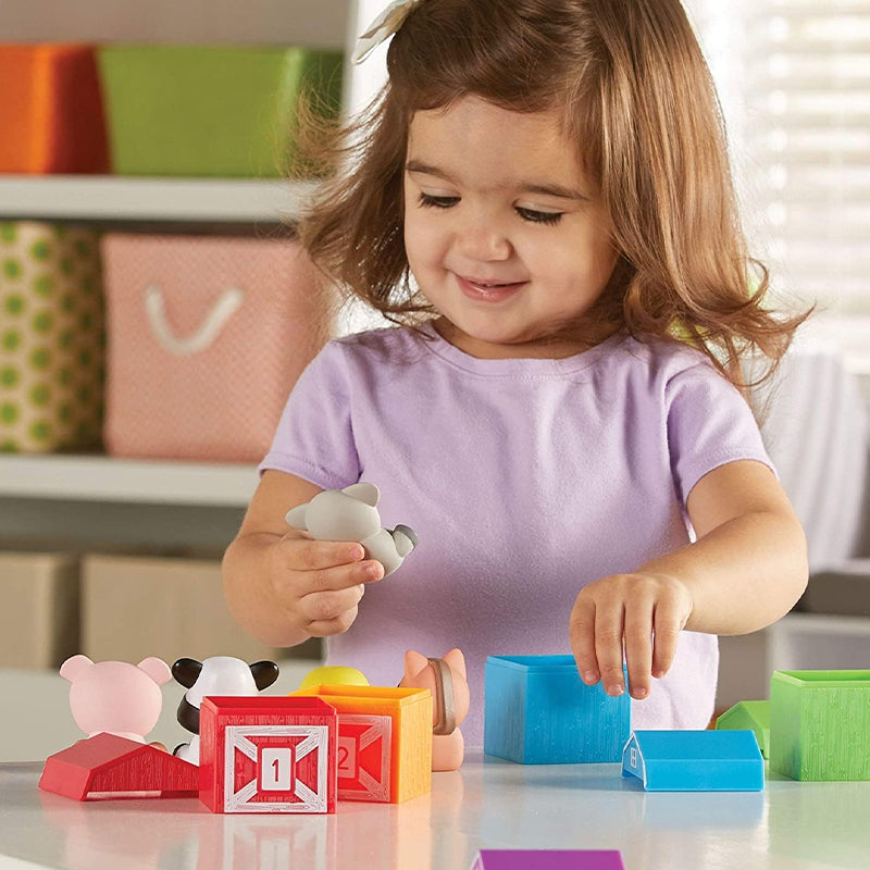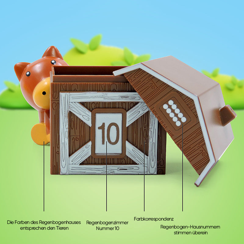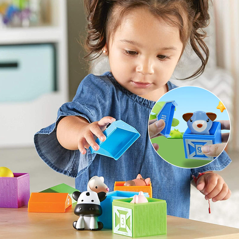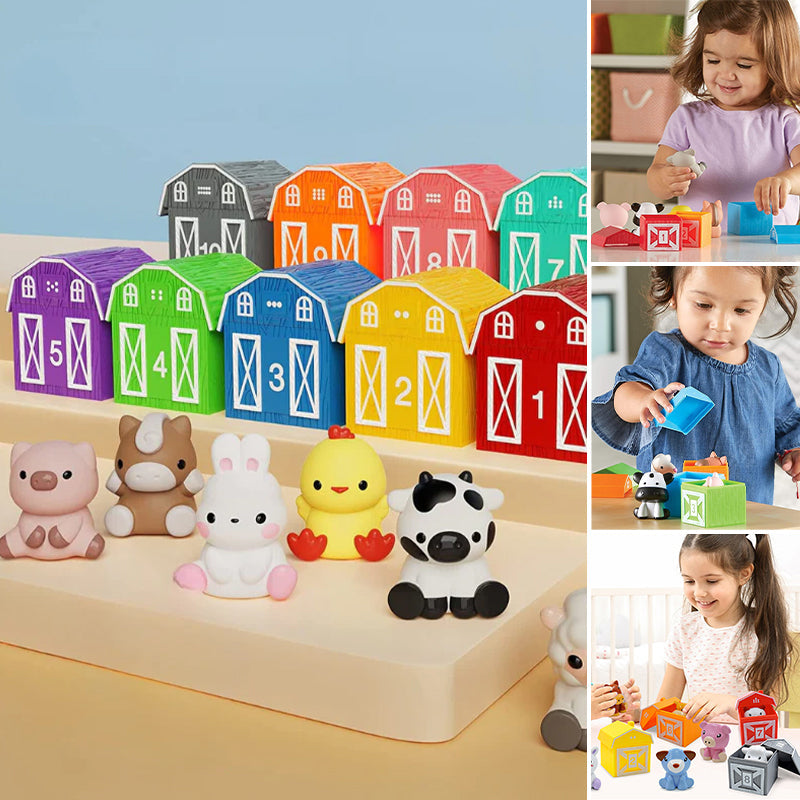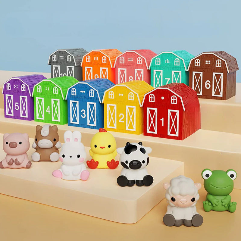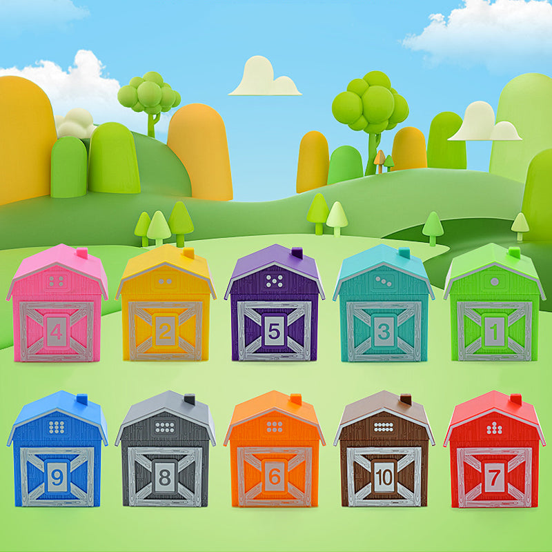Zuordnungs- und Sortierspielzeug für Kleinkinder: Zu jedem Tier gehört eine farbenfrohe Scheune, die mit aufgedruckten Zahlen und Zählpunkten dekoriert ist, damit Kleinkinder Zahlen lernen und das Zählen und Zuordnen üben können. Das Dach der Scheune lässt sich öffnen und schließen, so dass sich die Tiere perfekt einfügen können. Dadurch können Kinder spannende Draußen- und Drinnen-Spiele sowie Zuordnungs- und Sortieraktivitäten genießen und gleichzeitig ihre Feinmotorik entwickeln.