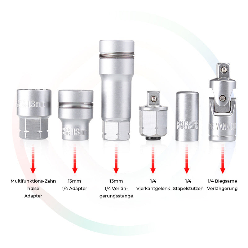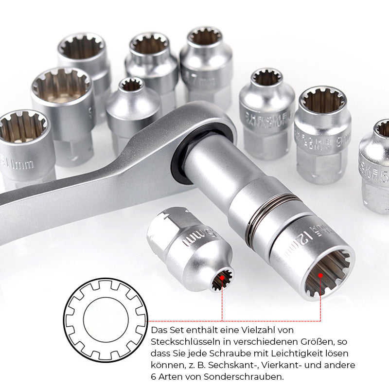 Das Set besteht aus hochwertigem Chrom-Vanadium-Stahl und ist daher extrem langlebig und widerstandsfähig gegen hohe Drehmomente. Das Set enthält eine Vielzahl von Steckschlüsseln in verschiedenen Größen, so dass Sie jede Schraube mit Leichtigkeit lösen können, z. B. Sechskant-, Vierkant- und andere 6 Arten von Sonderschrauben. Der Ratschengriff ist auf maximalen Komfort und Effizienz ausgelegt, so dass Sie leicht zwischen verschiedenen Steckschlüsseln wechseln können.