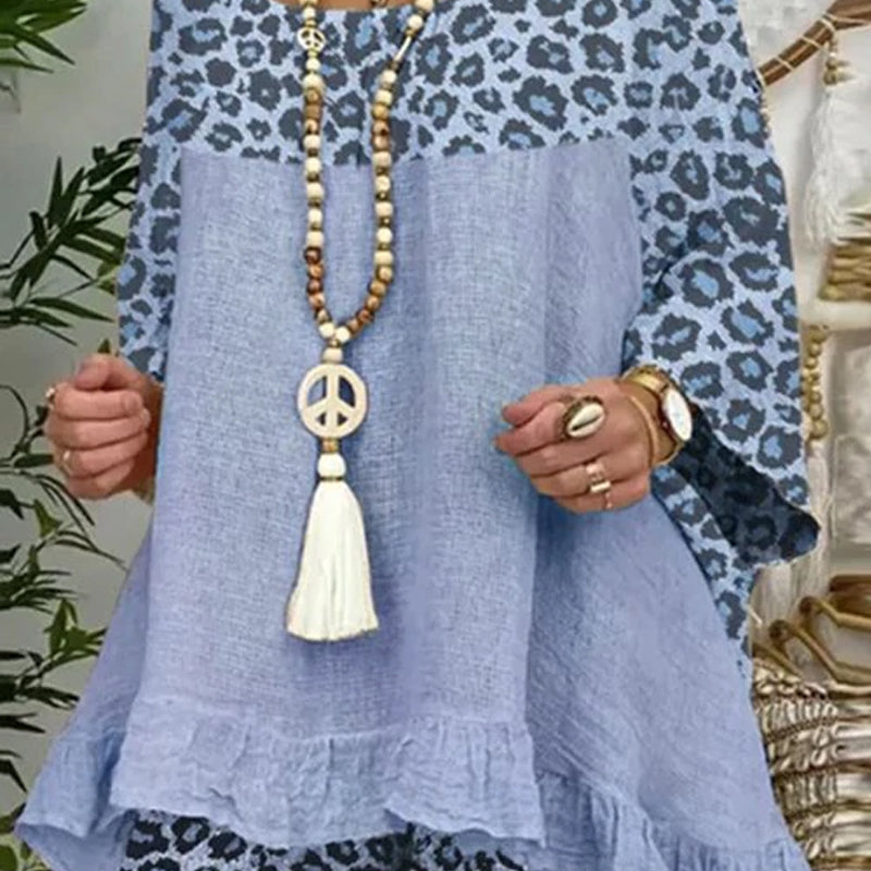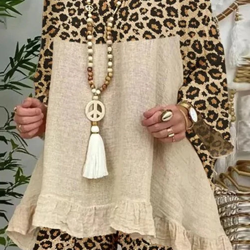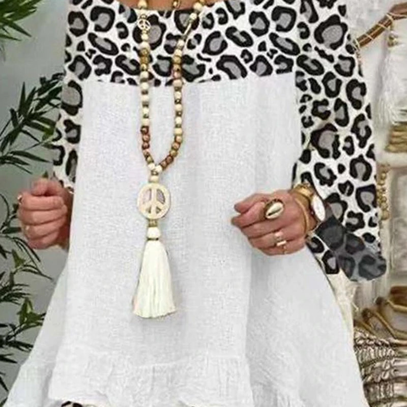 • Lässiger Stil, Leopardenmuster, lange Ärmel, Rundhalsausschnitt, weich, gepaart mit Leopardenshorts.