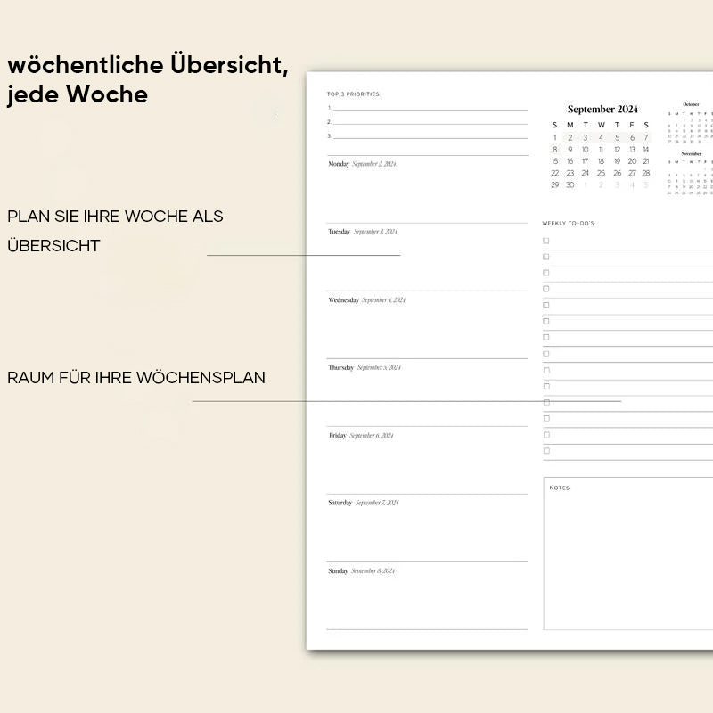 Von einem Ort, an dem Sie Ihre jährlichen Aufgaben nachverfolgen können, über eine Seite zum Organisieren von Weihnachtsgeschenken bis hin zu einer wöchentlichen Reinigungscheckliste – der Tagesplaner bietet alles, was Sie brauchen, um Ihr Leben, Ihre Arbeit und Ihr Privatleben so organisiert wie nie zuvor zu halten.